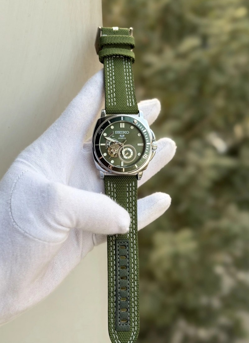 Seiko 5 Sports watch with a green fabric strap and a green dial. The watch features a stainless steel case and luminous hands and markers. The watch also has an open heart design, showcasing the automatic movement.