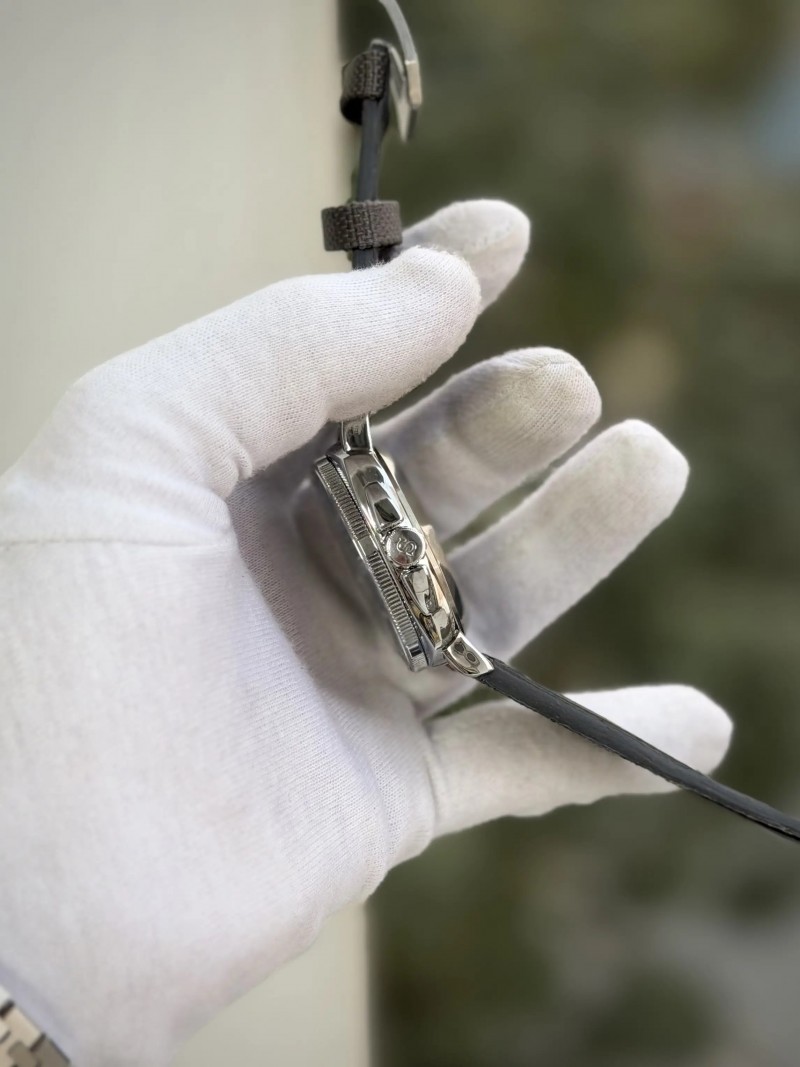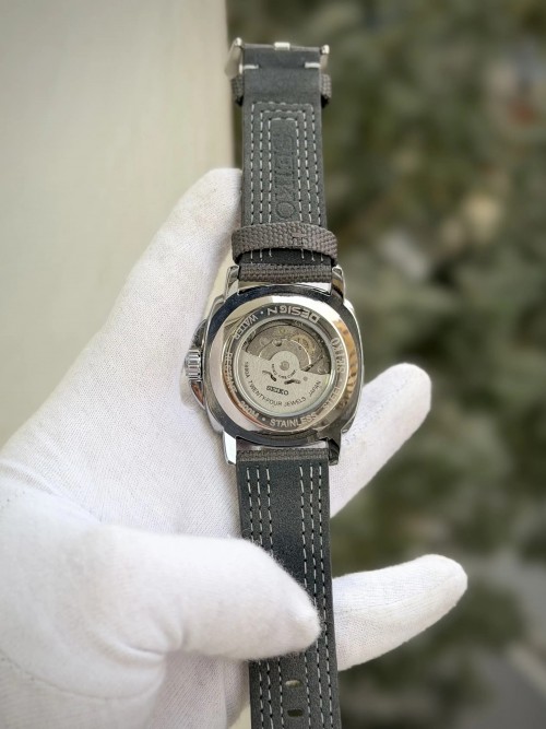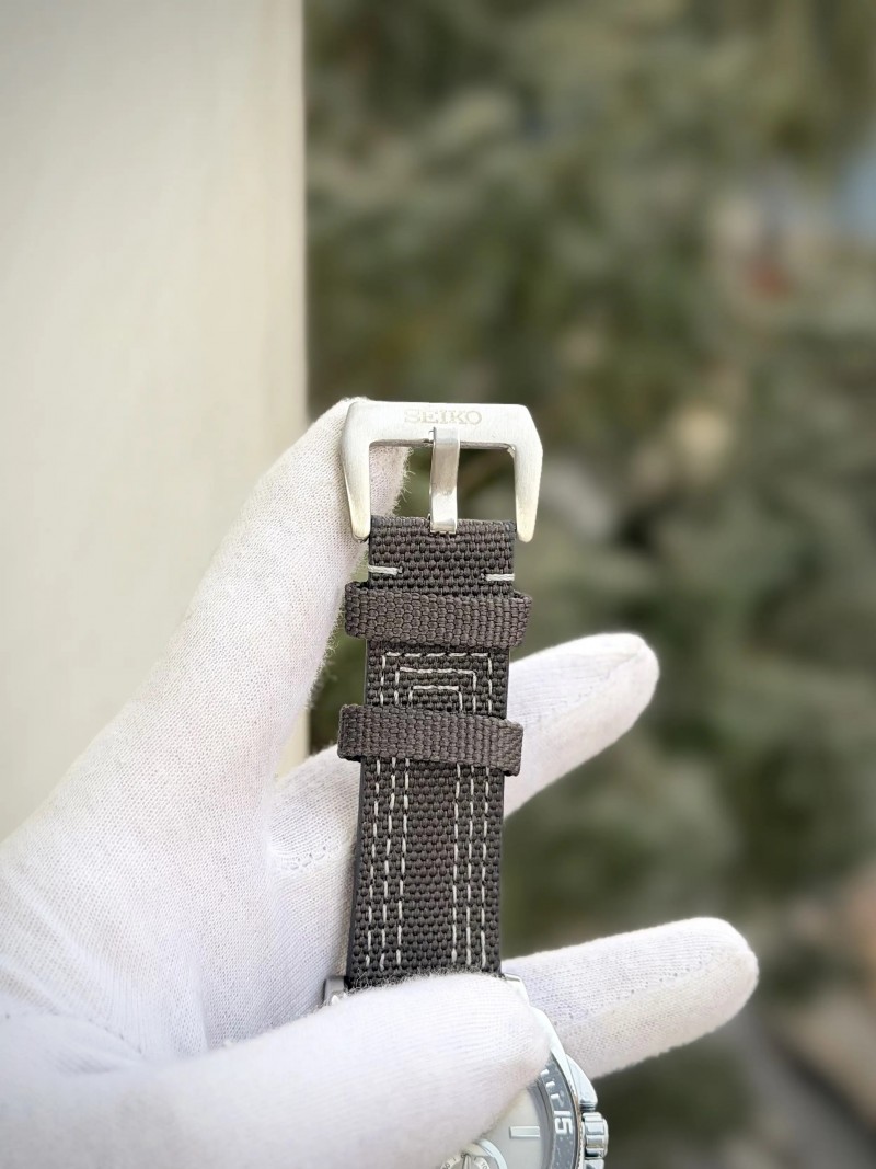 Seiko 5 Sports watch with a grey fabric strap and a Gradient Grey dial. The watch features a stainless steel case and luminous hands and markers. The watch also has an open heart design, showcasing the automatic movement.
