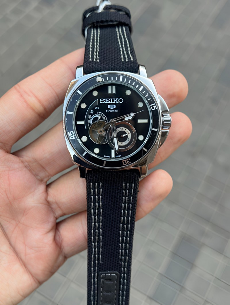 Brand: Seiko, a Japanese watchmaker known for reliability and innovation. Series: Seiko 5 Sports, a collection known for its durability and value. Movement: Automatic, meaning it's powered by the wearer's motion. Features: Day-date display. Recessed crown. Durable case and bracelet. Rotating bezel. Lumibrite on hands and indices for low-light visibility. Dial: Black with a sunburst finish. Bracelet/Strap: Black with white stitching. Design: Sporty, with a dual-tone bezel. Origin: The Seiko 5 series was introduced in 1963, with five key attributes. Durability: Built to withstand everyday wear and tear.